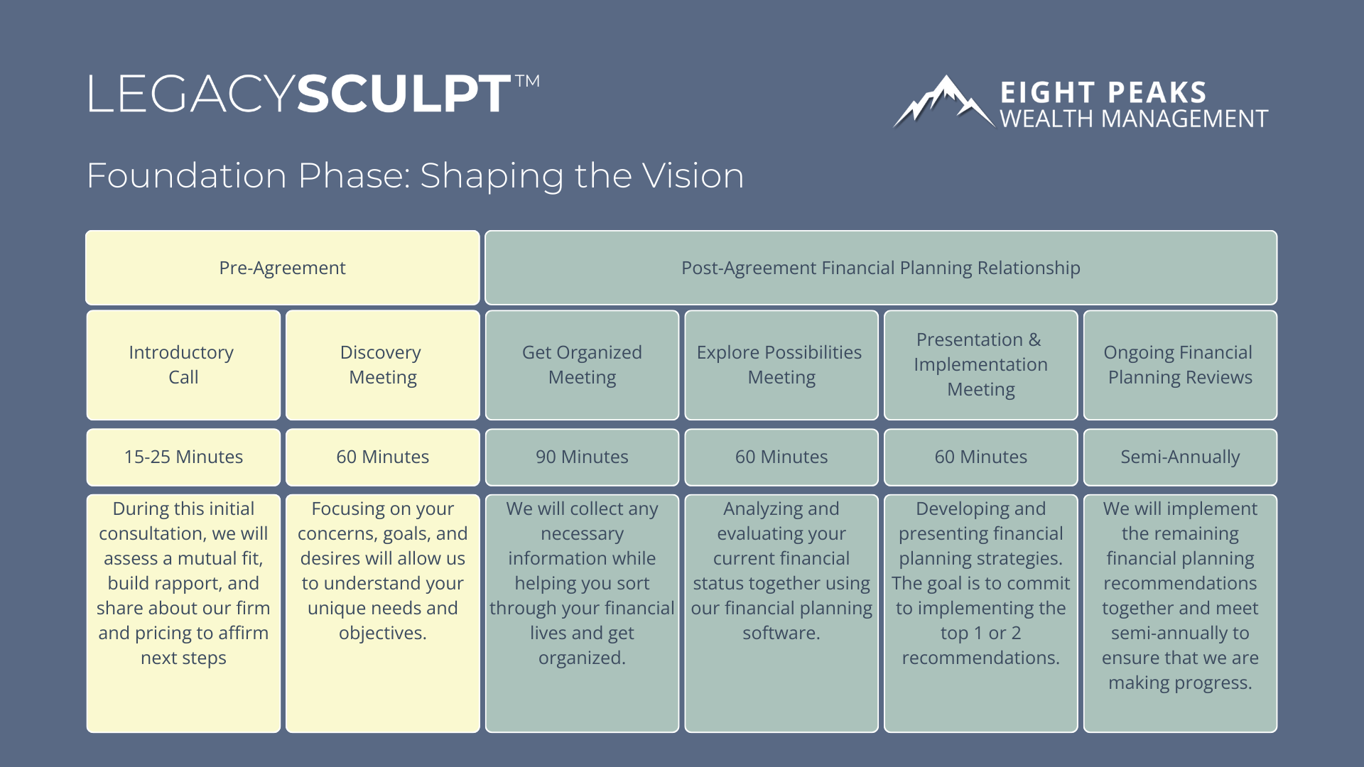 We expect you to invest all your investable assets with Eight Peaks – so we can have a thorough understanding of your financial life and make changes easily as necessary.